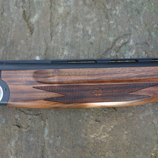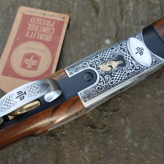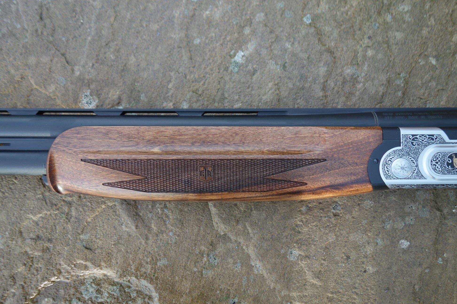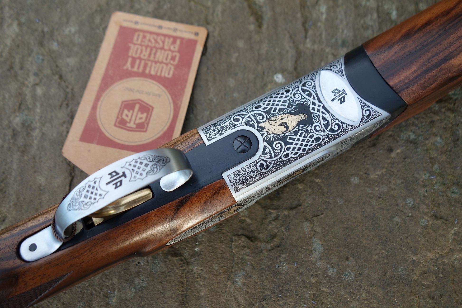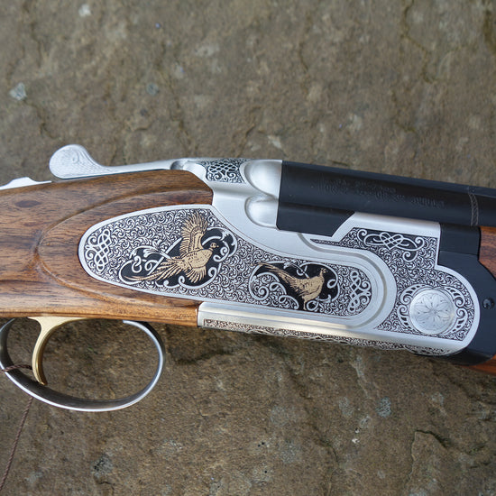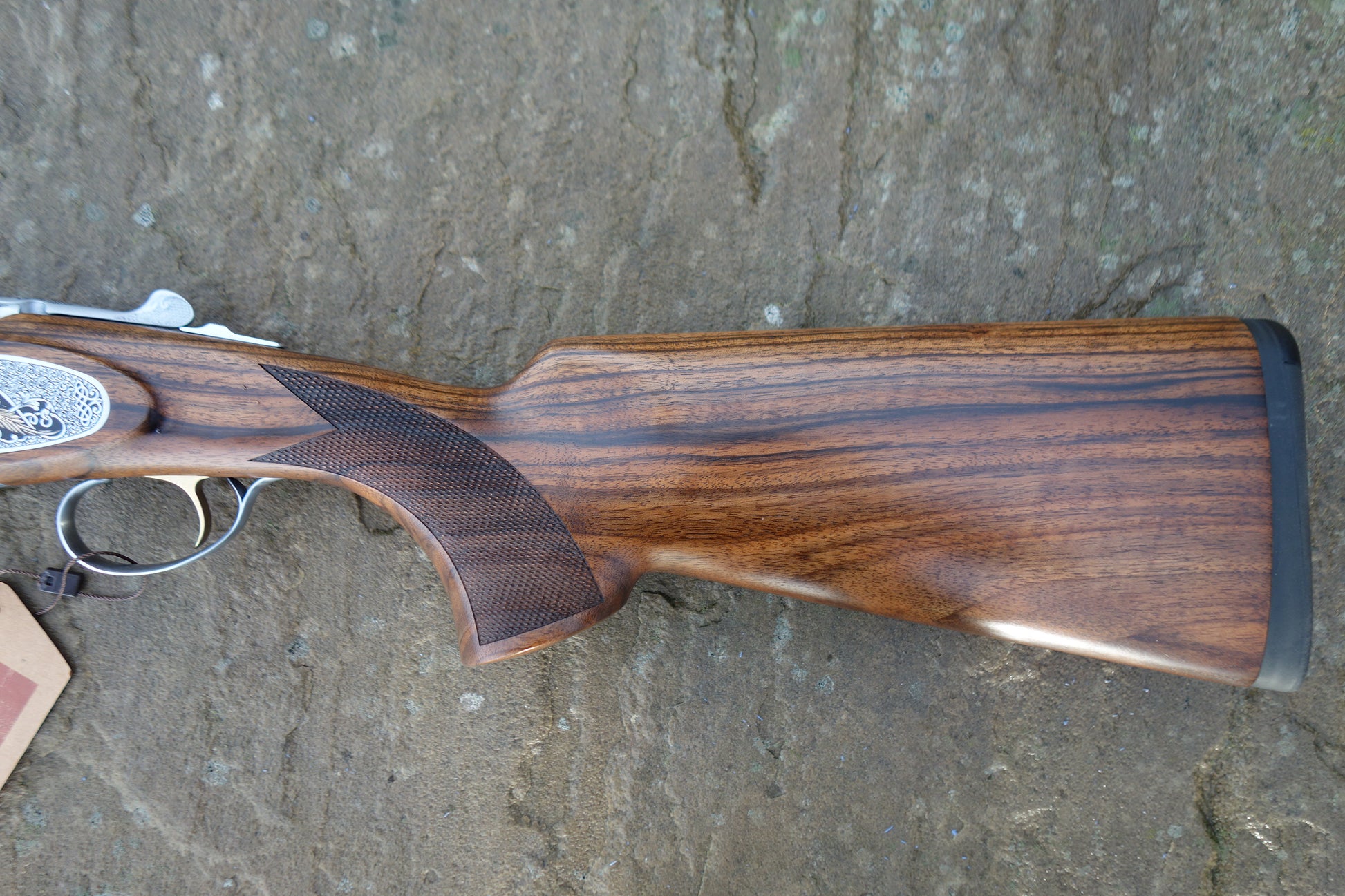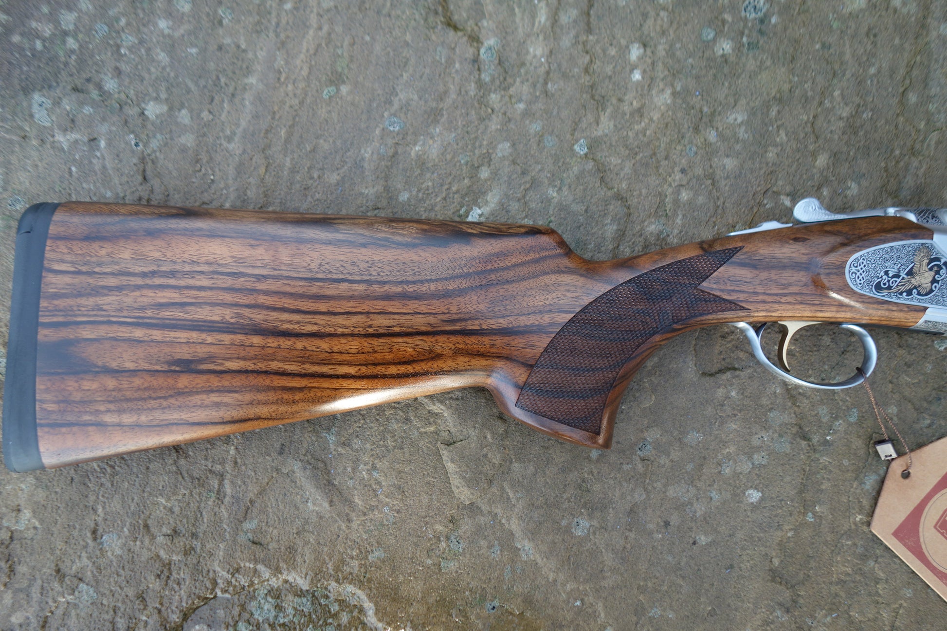 Factory left hand stock with very attractive figuring, sideplate receiver with gold inlaid game scenes, matt black barrels with vent side ribs and flush multi chokes, 3" magnum and HP steel proofed.
