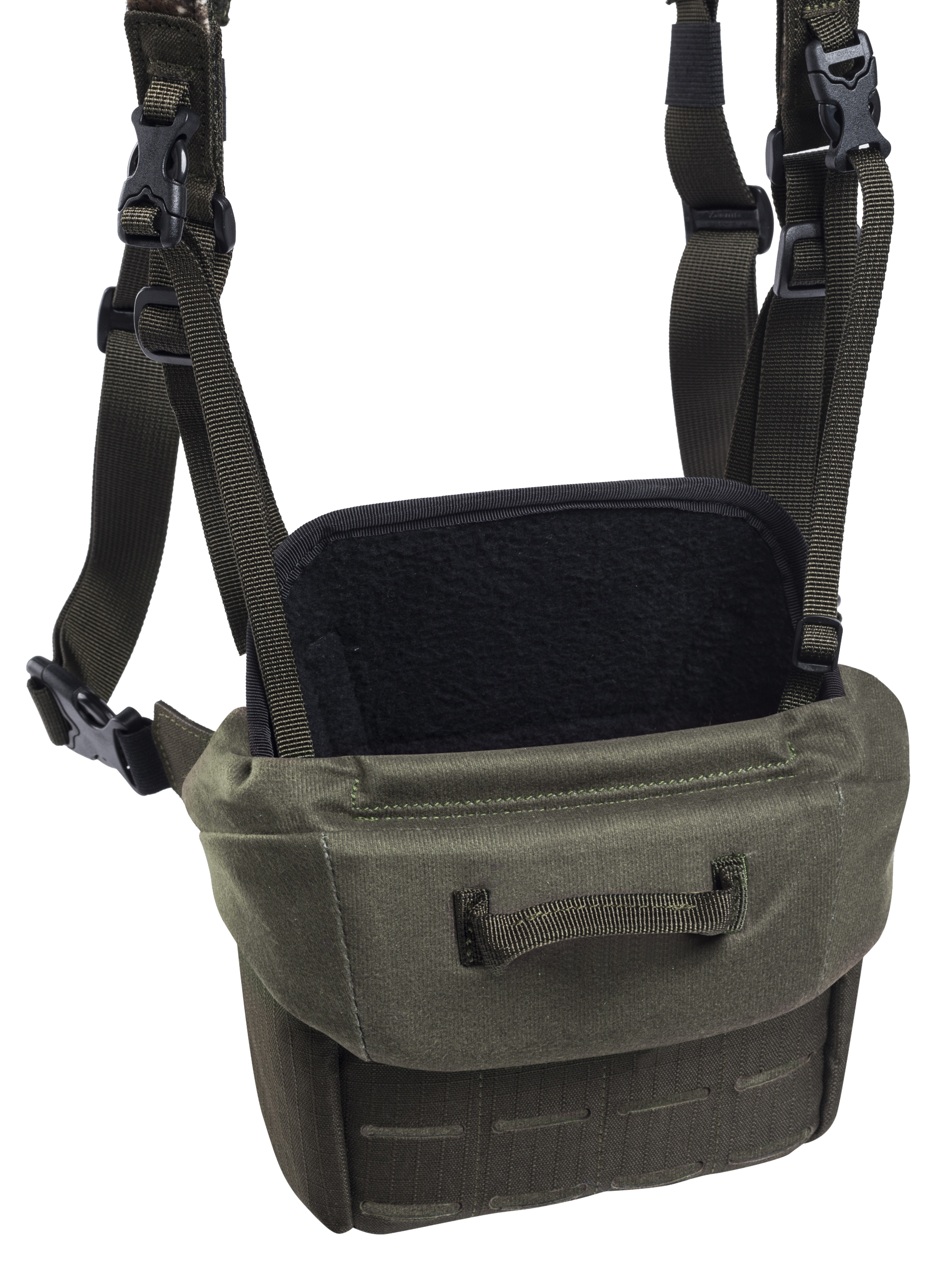 Easy one-hand opening. Laser-cut MOLLE panels on the front, sides and bottom. Safety straps for the binoculars. Shock absorbing EVA inserts. Fitted with an elasticated laser rangefinder pocket with MOLLE interface.