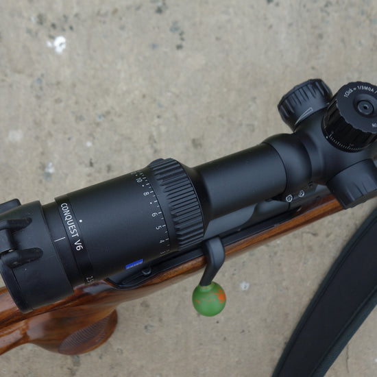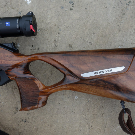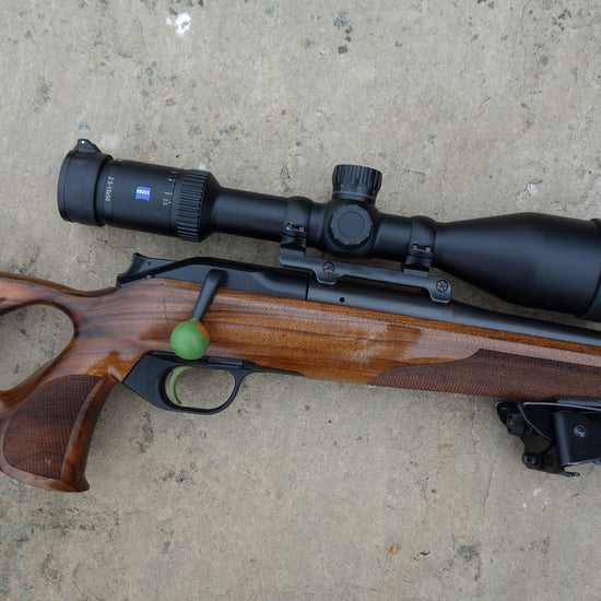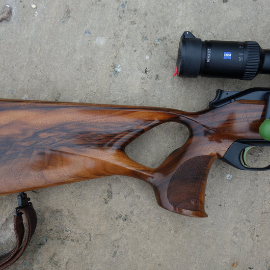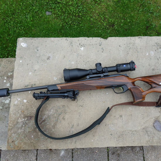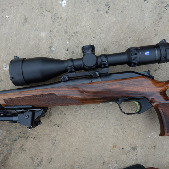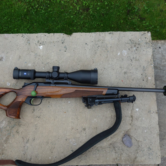 Grade 7 highly figured thumb hole stock, Blaser QD scope mount with Zeiss V6 Conquest 2.5-15x56 illuminated scope, Blaser sound moderator and sling, Harris Bipod.