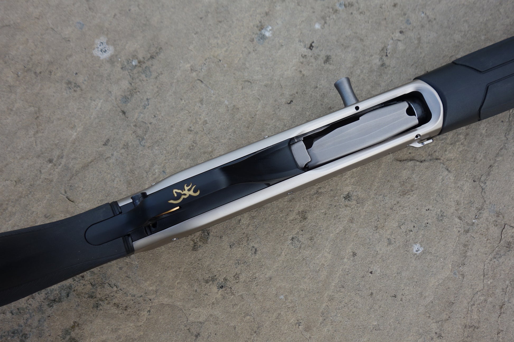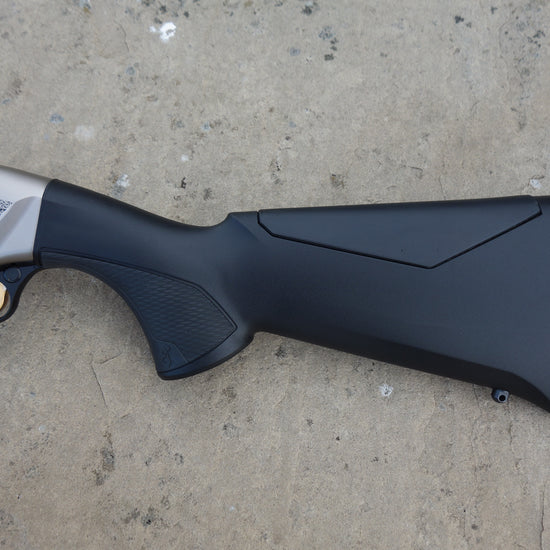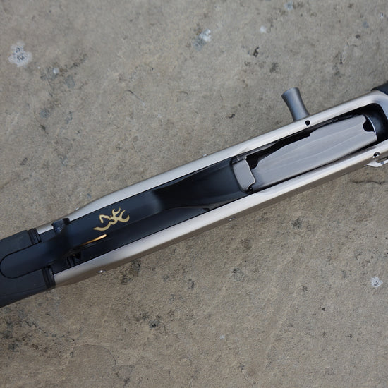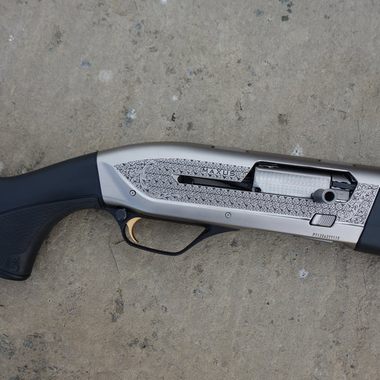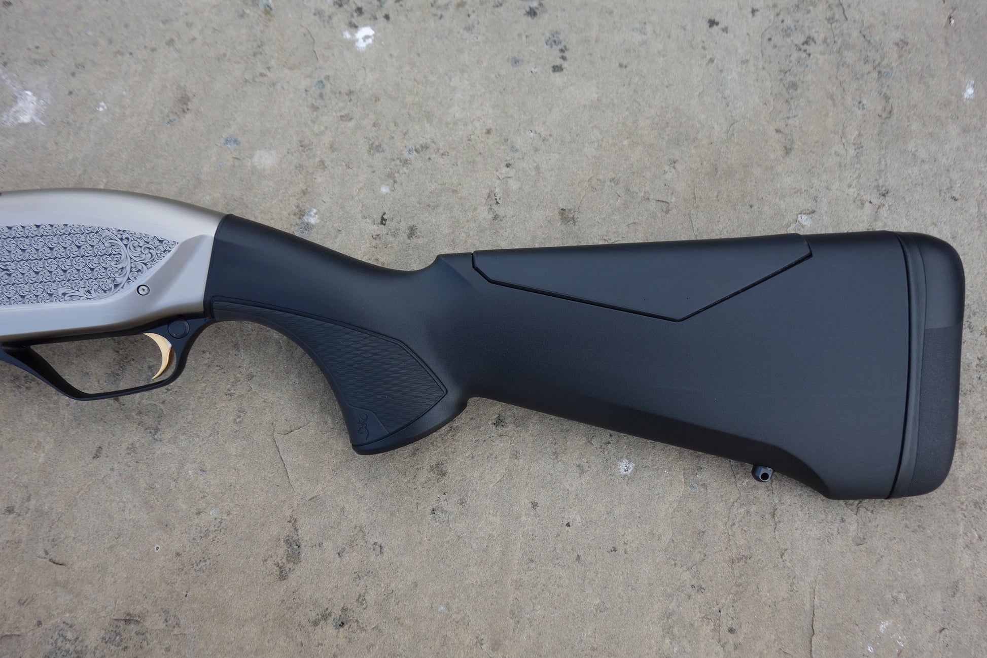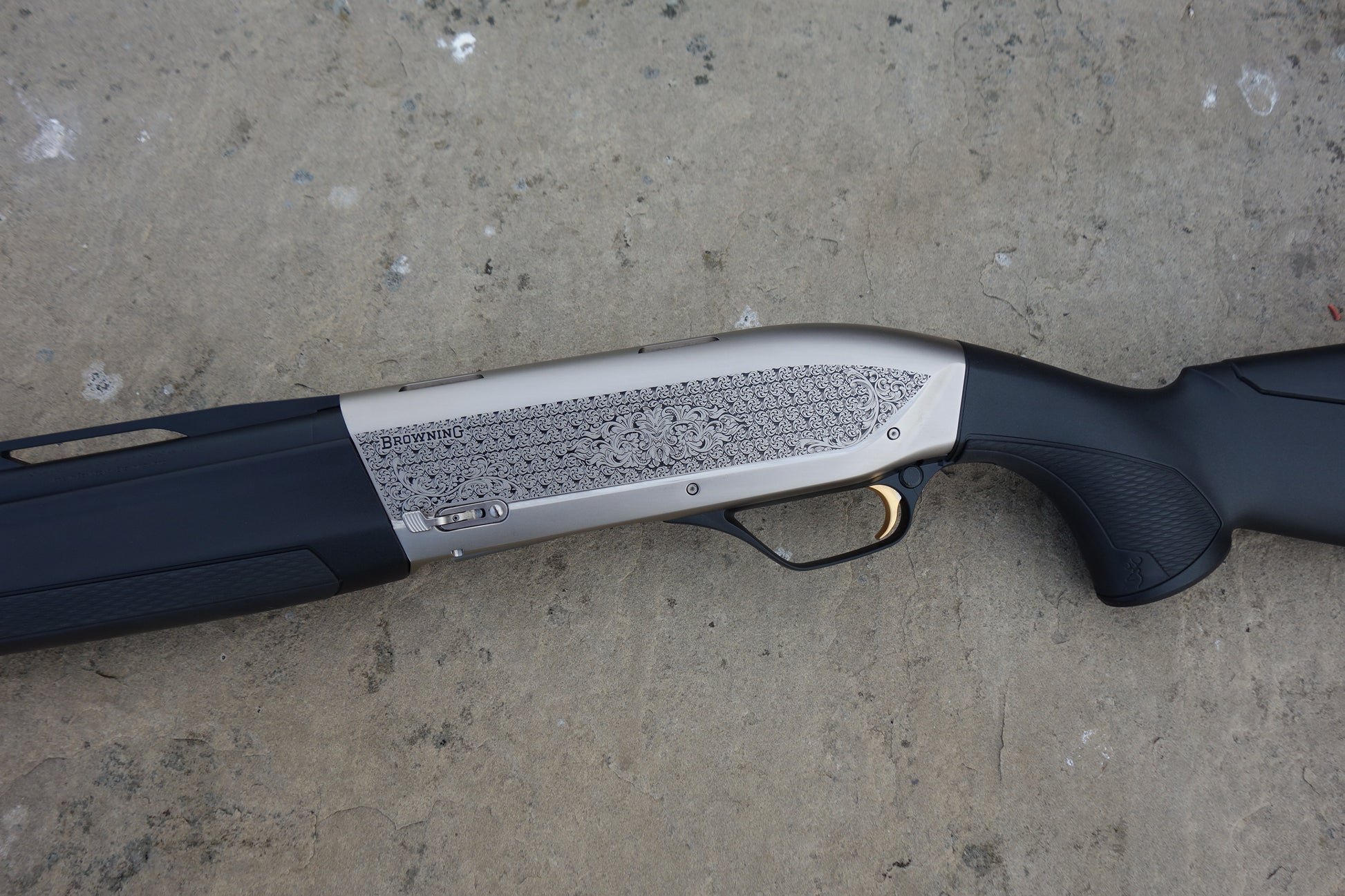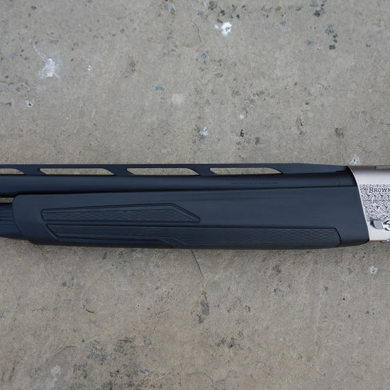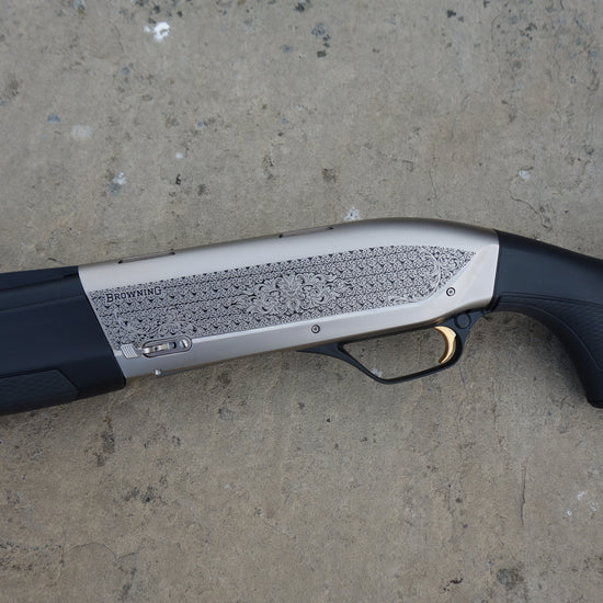 Fully scroll engraved receiver with magazine cut off and new styled black synthetic stock and forend, matt black barrel fitted with invector plus chokes and high viz front sight, Inflex recoil pad, Browning ABS case, as new condition.