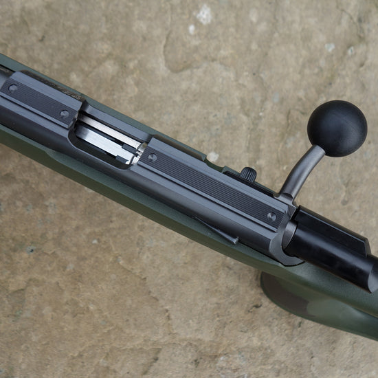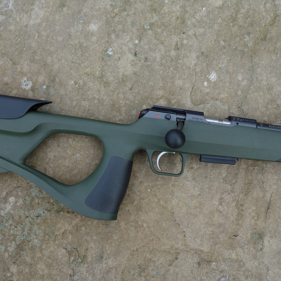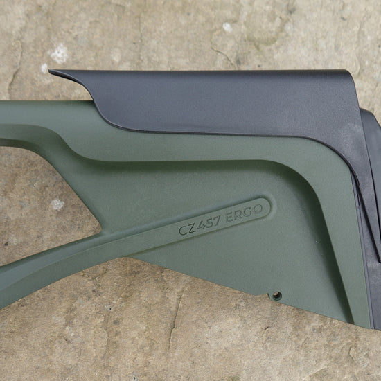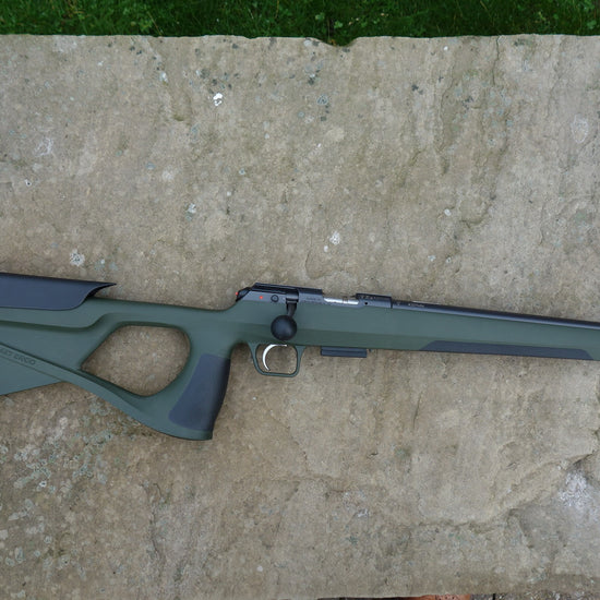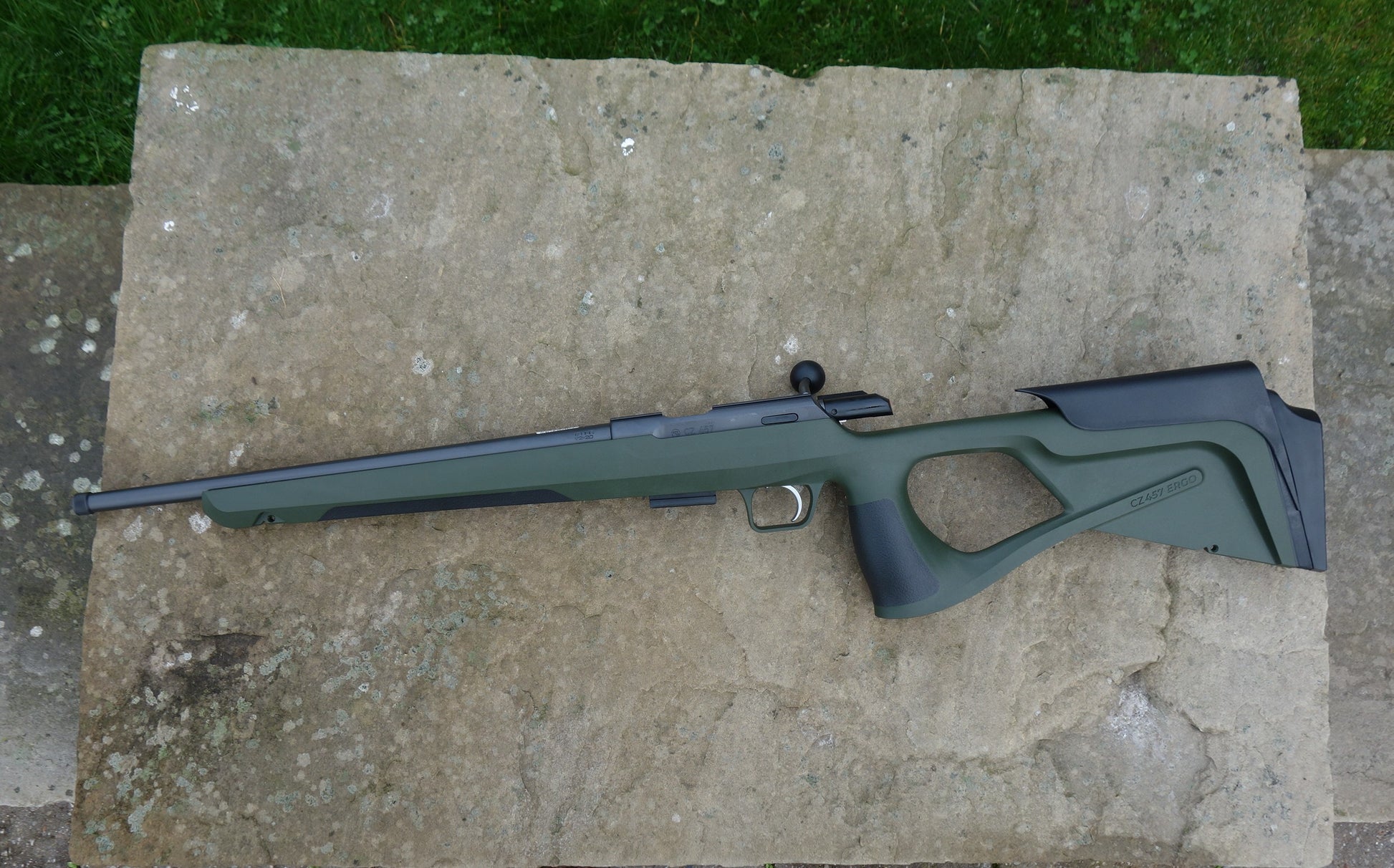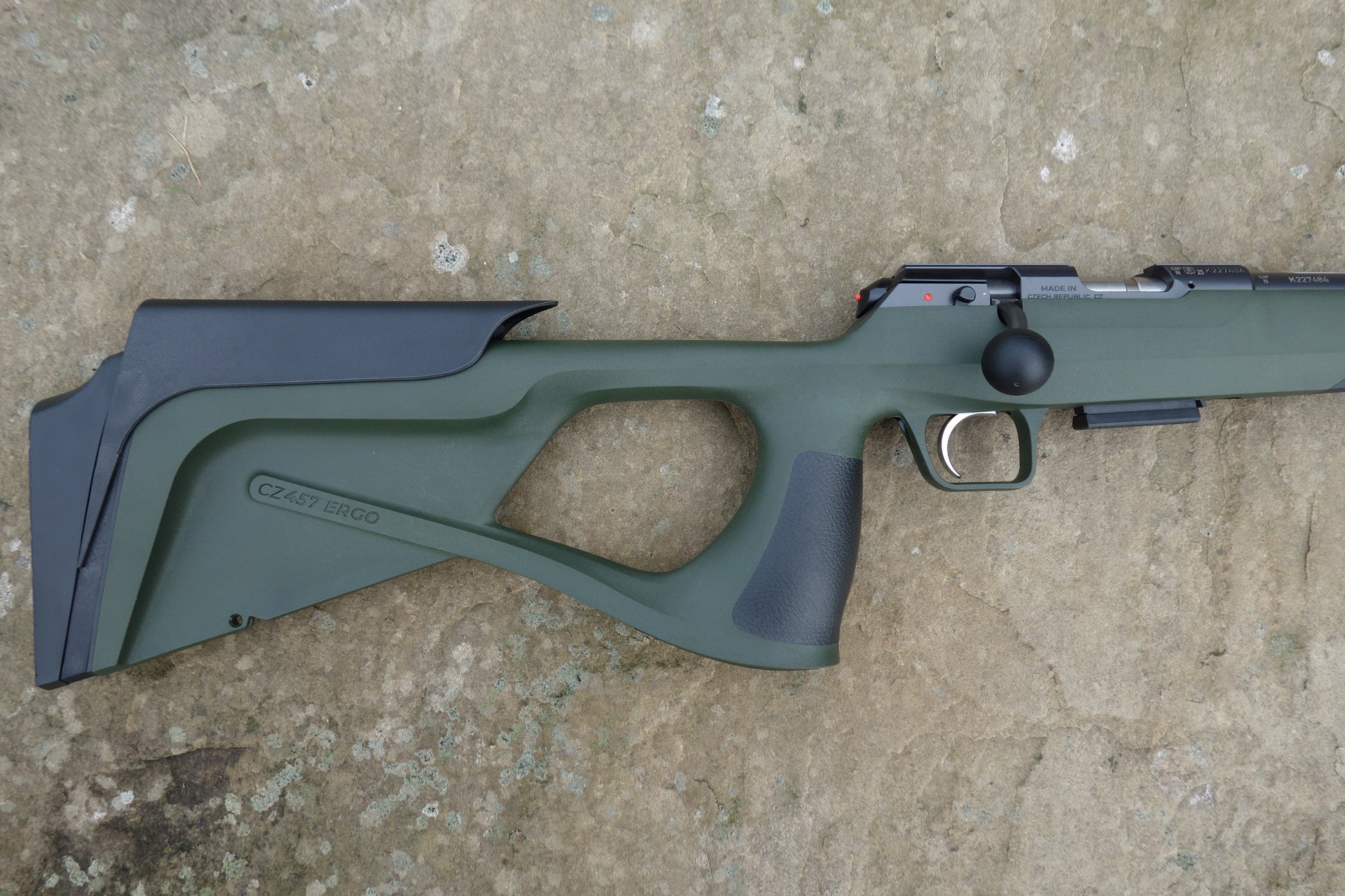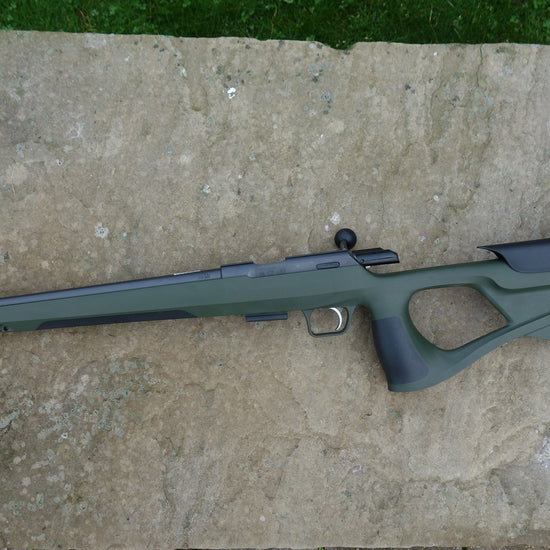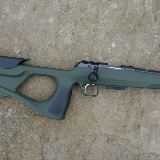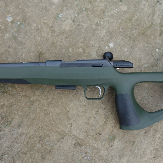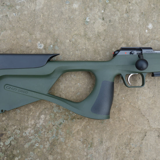 Latest model from CZ with a very attractive green synthetic stock, thumb hole design with interchangeable cheek piece, 16" barrel screw cut 1/2" unf, 5 round detachable magazine,