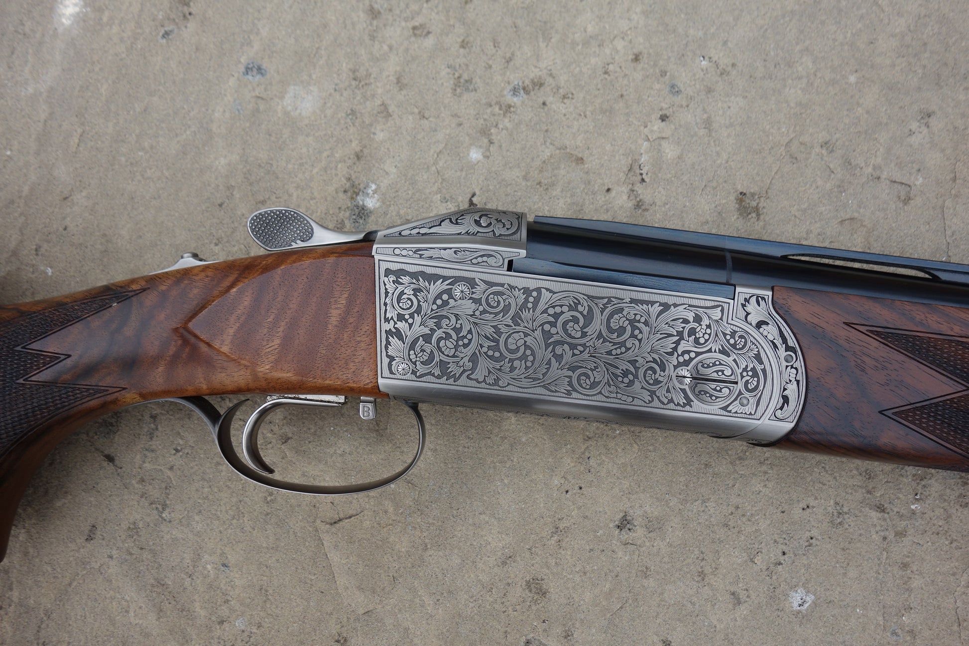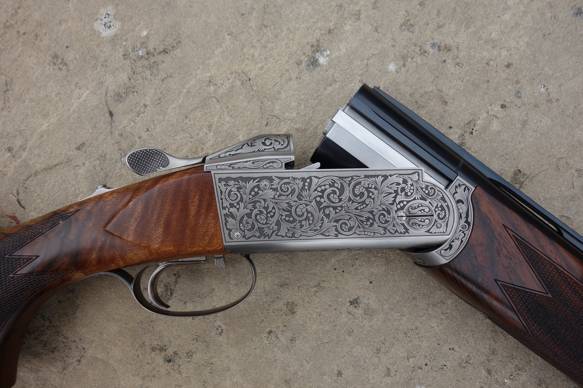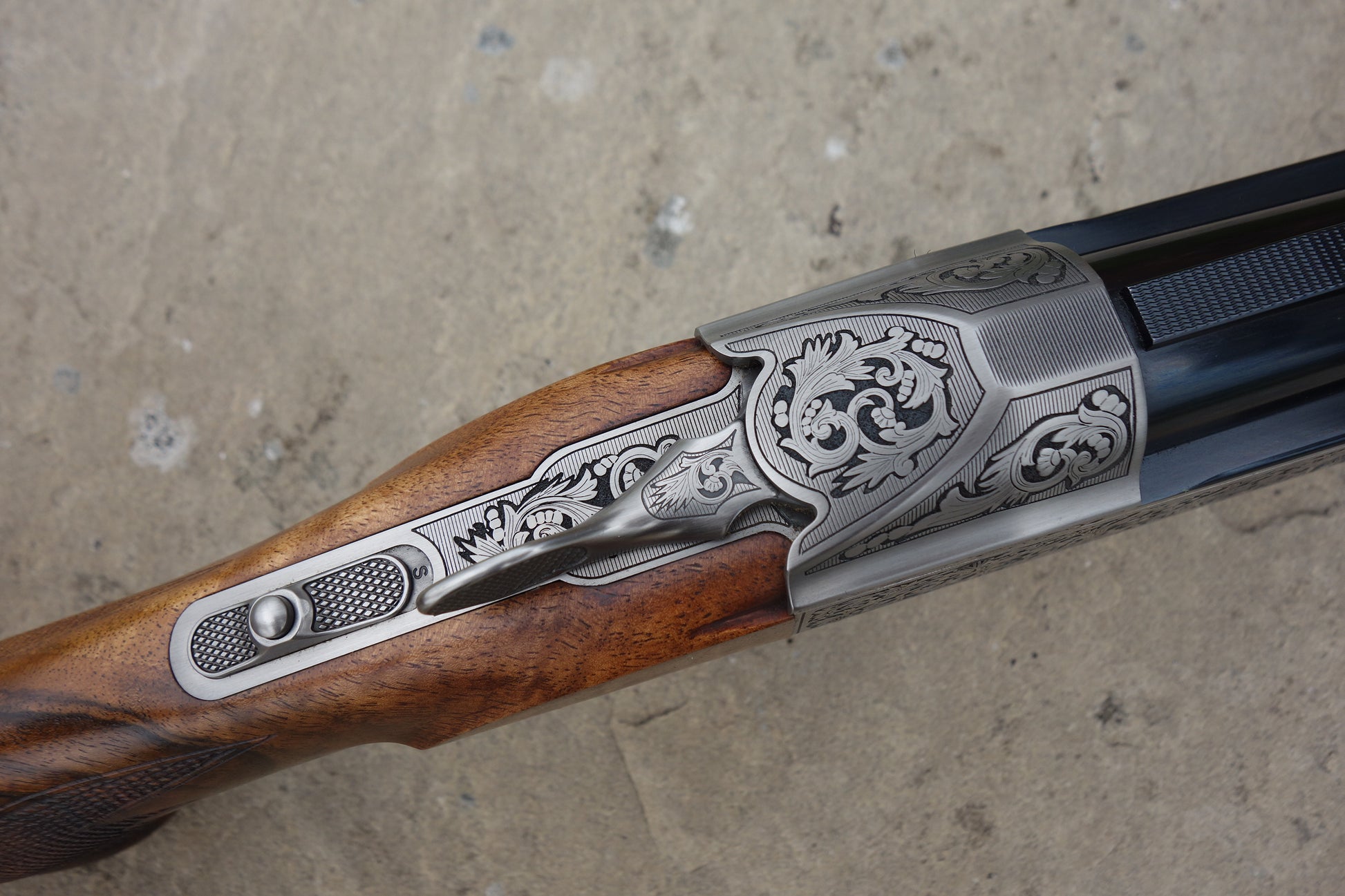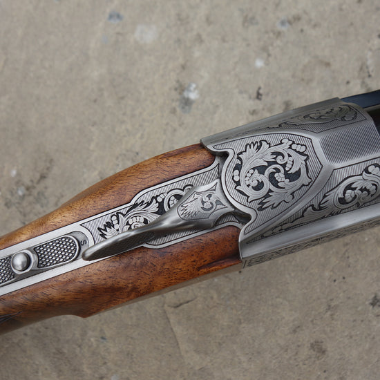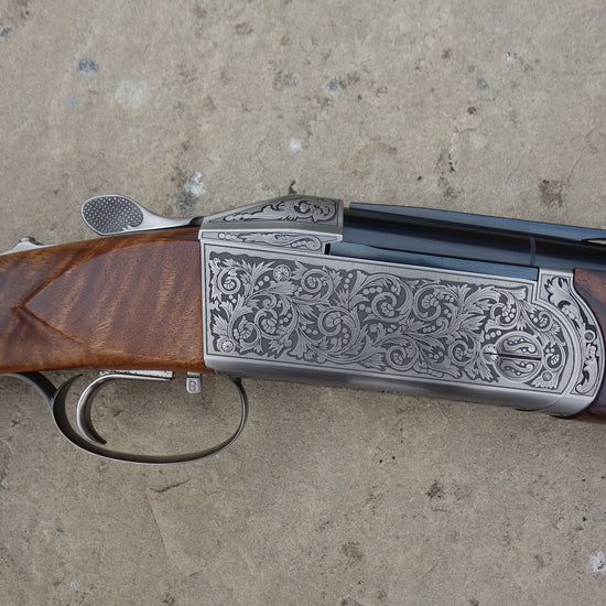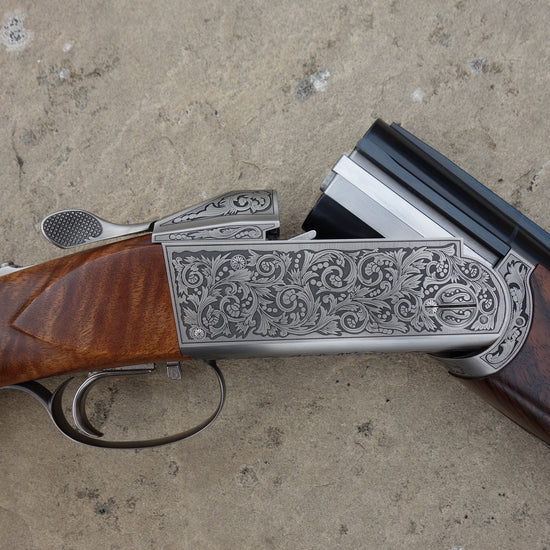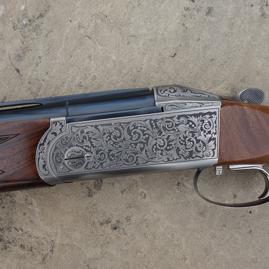 Factory left hand Sovereign scroll engraved with adjustable stock in beautiful Cat 3 timber, Sovereign scroll engraved receiver and metal work, 3" mag and HP steel proofed, ABS K-80 case with spare chokes, as new condition.