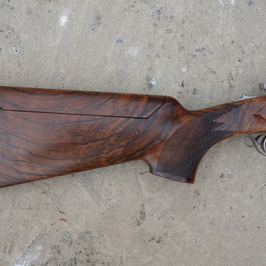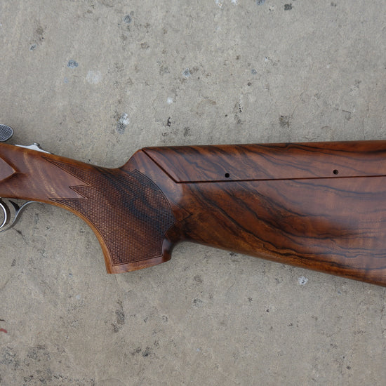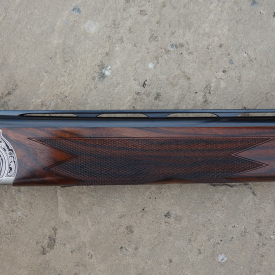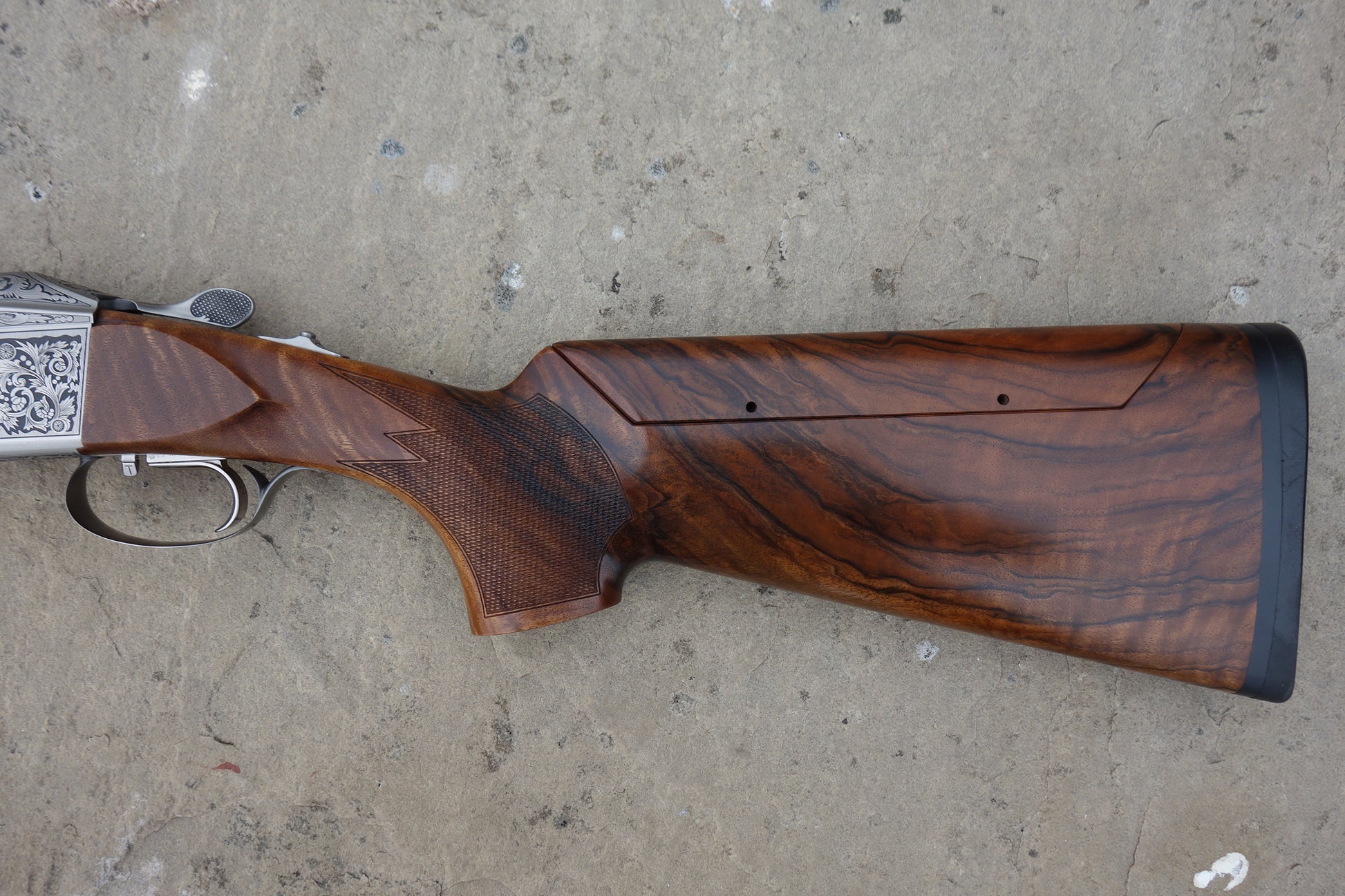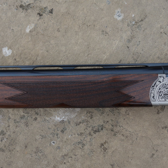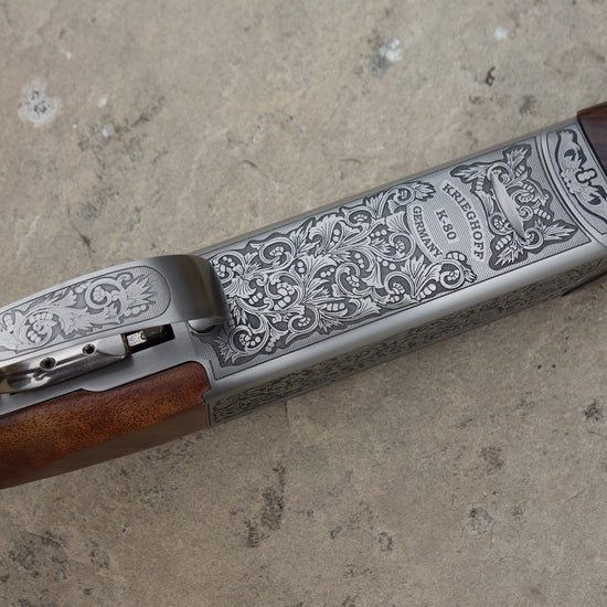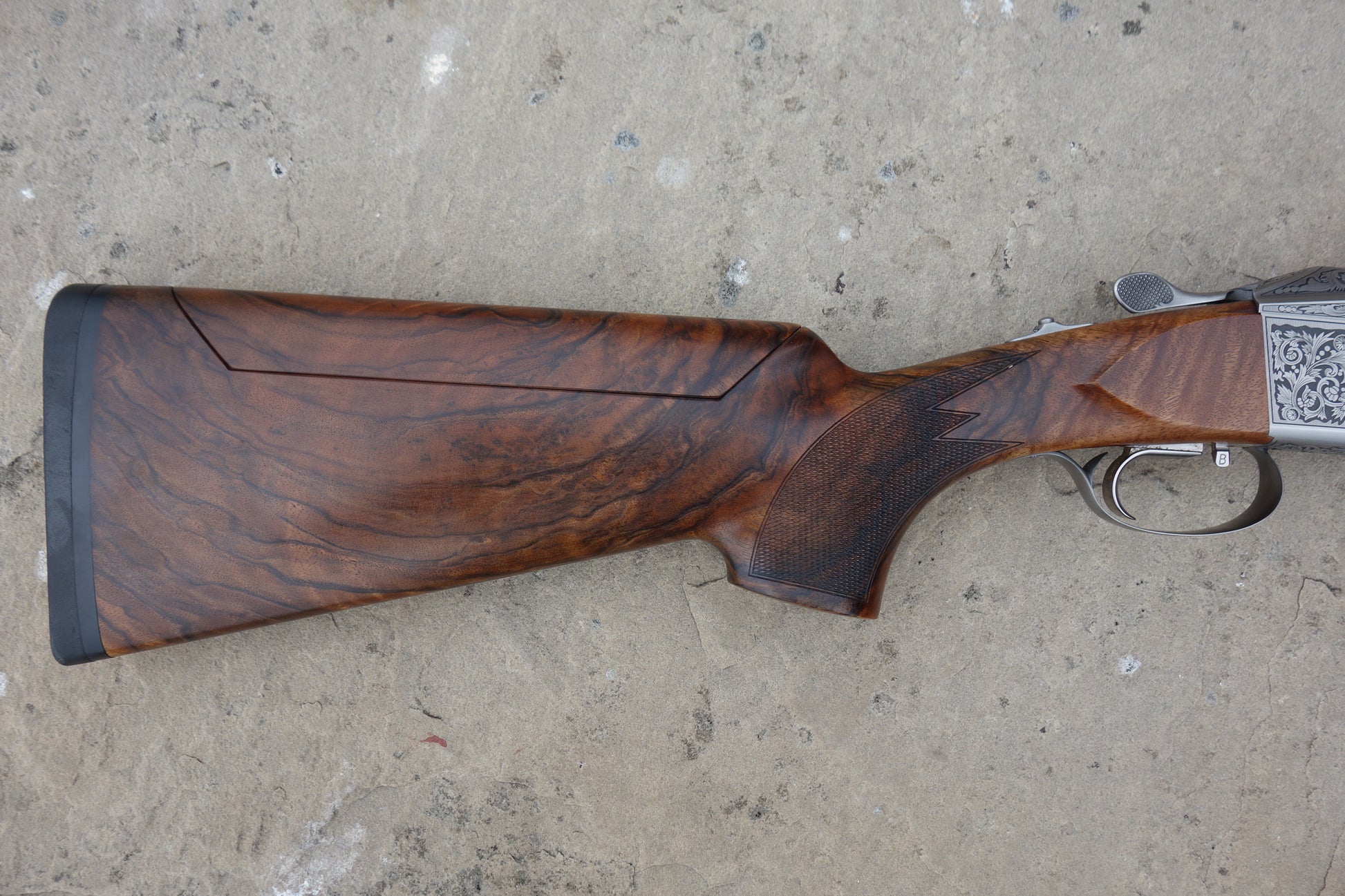 Factory left hand Sovereign scroll engraved with adjustable stock in beautiful Cat 3 timber, Sovereign scroll engraved receiver and metal work, 3" mag and HP steel proofed, ABS K-80 case with spare chokes, as new condition.