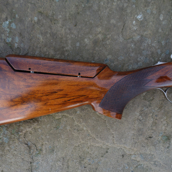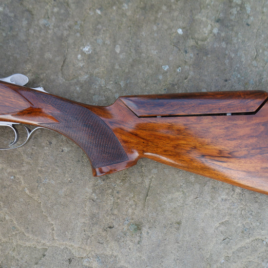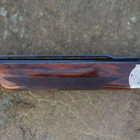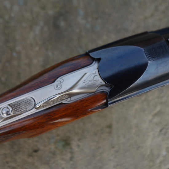 Arabesque scroll receiver with step taper top rib, adjustable comb stock and kick-eez recoil pad, trap forend, 2 3/4" chambers, 2 x Teague super extended chokes 1/2 & 3/4, news style ABS travel case.