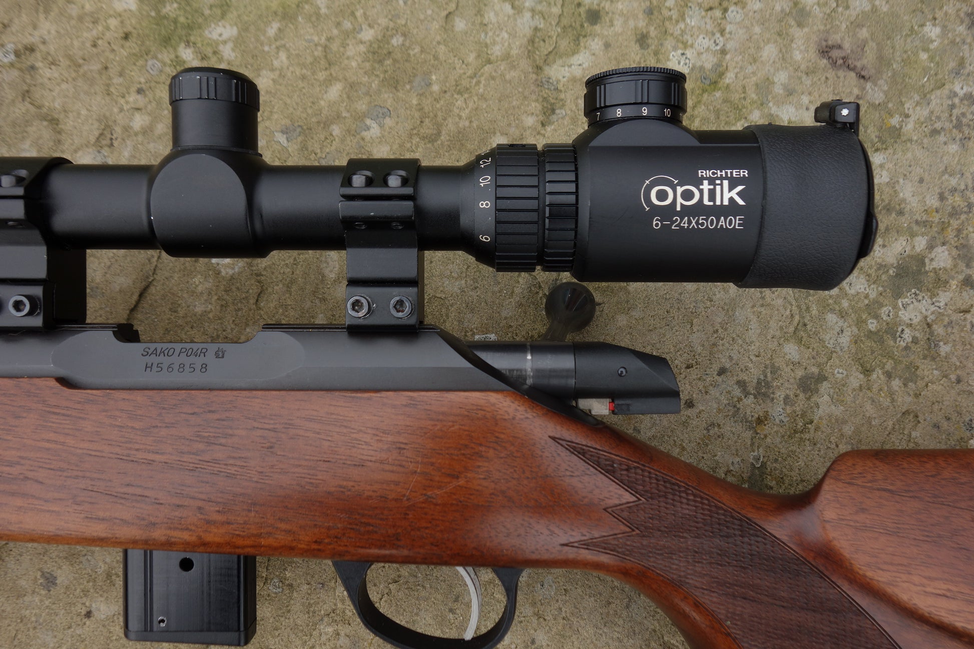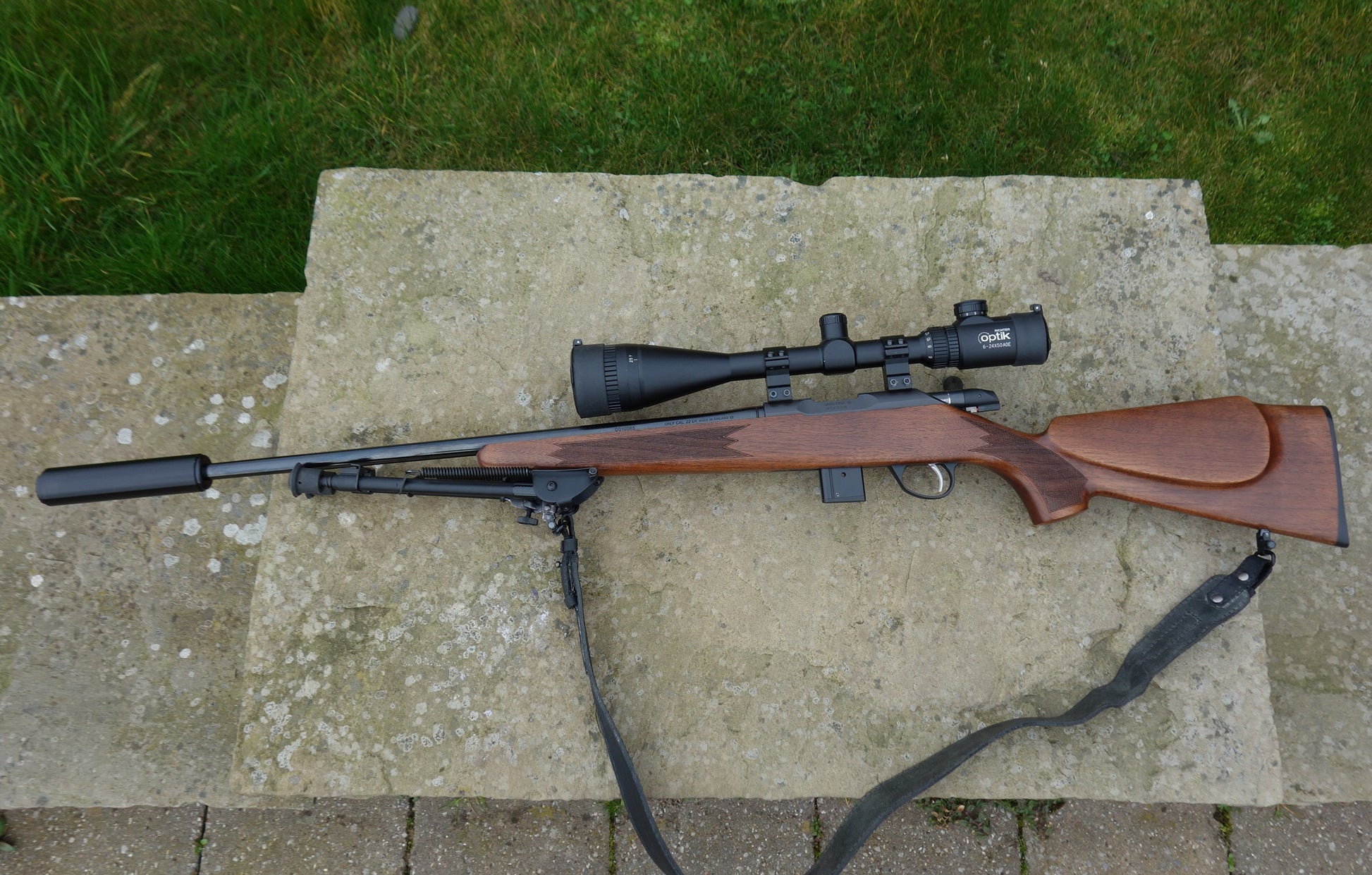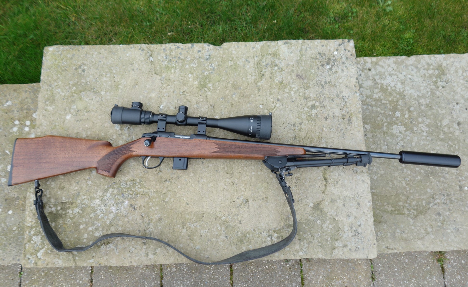 Complete with 6-24x56 illuminated scope, leather sling, SAKS sound moderator and 10 shot magazine.