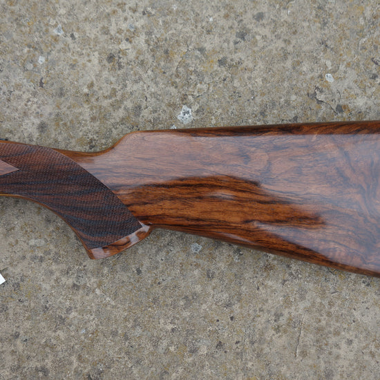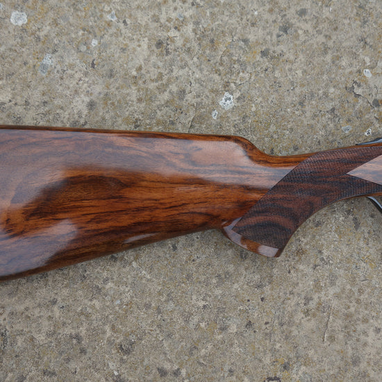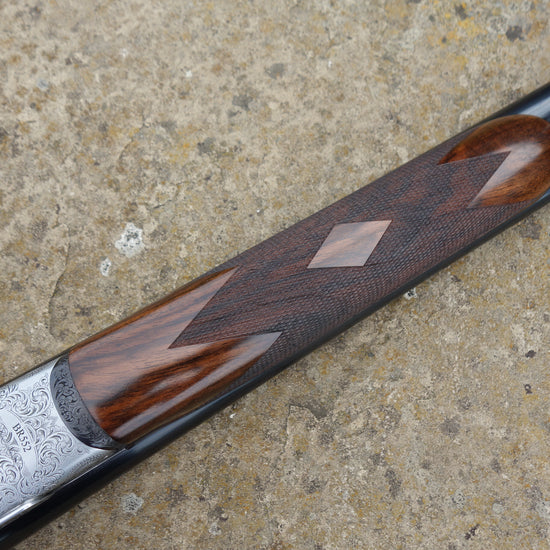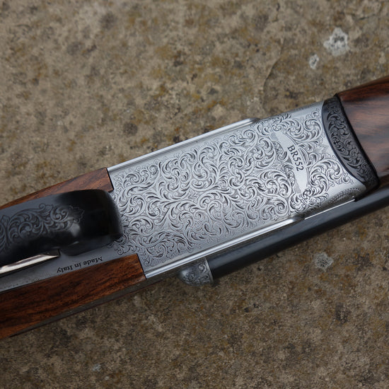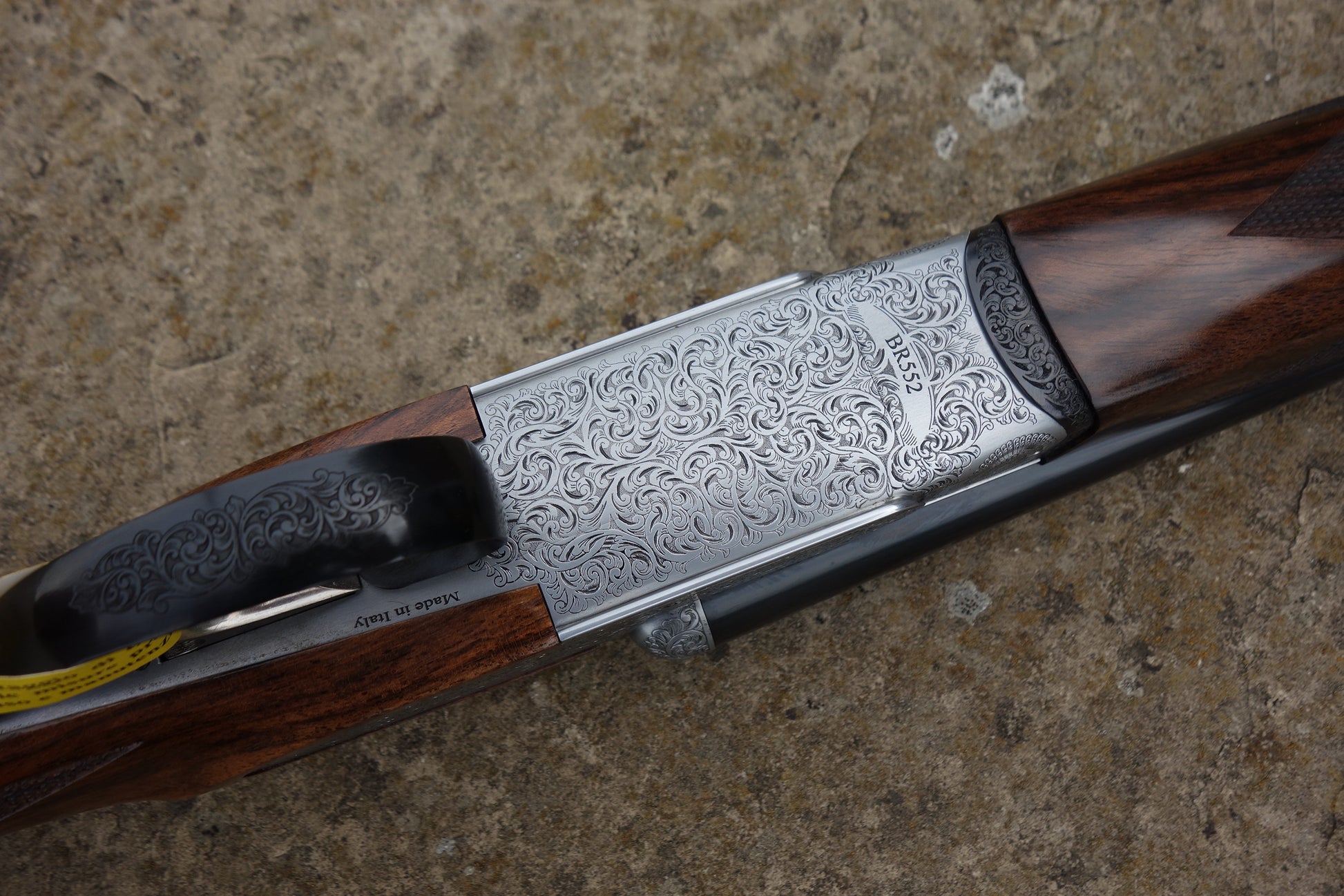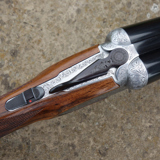 A beautifully scroll engraved sideplate receiver paired to a highly figured pistol grip stock and splinter forend, a modern side by side suitable for all loads including HP steel, 3" chambers and flush fitting multi chokes, single selective trigger and auto safety catch.