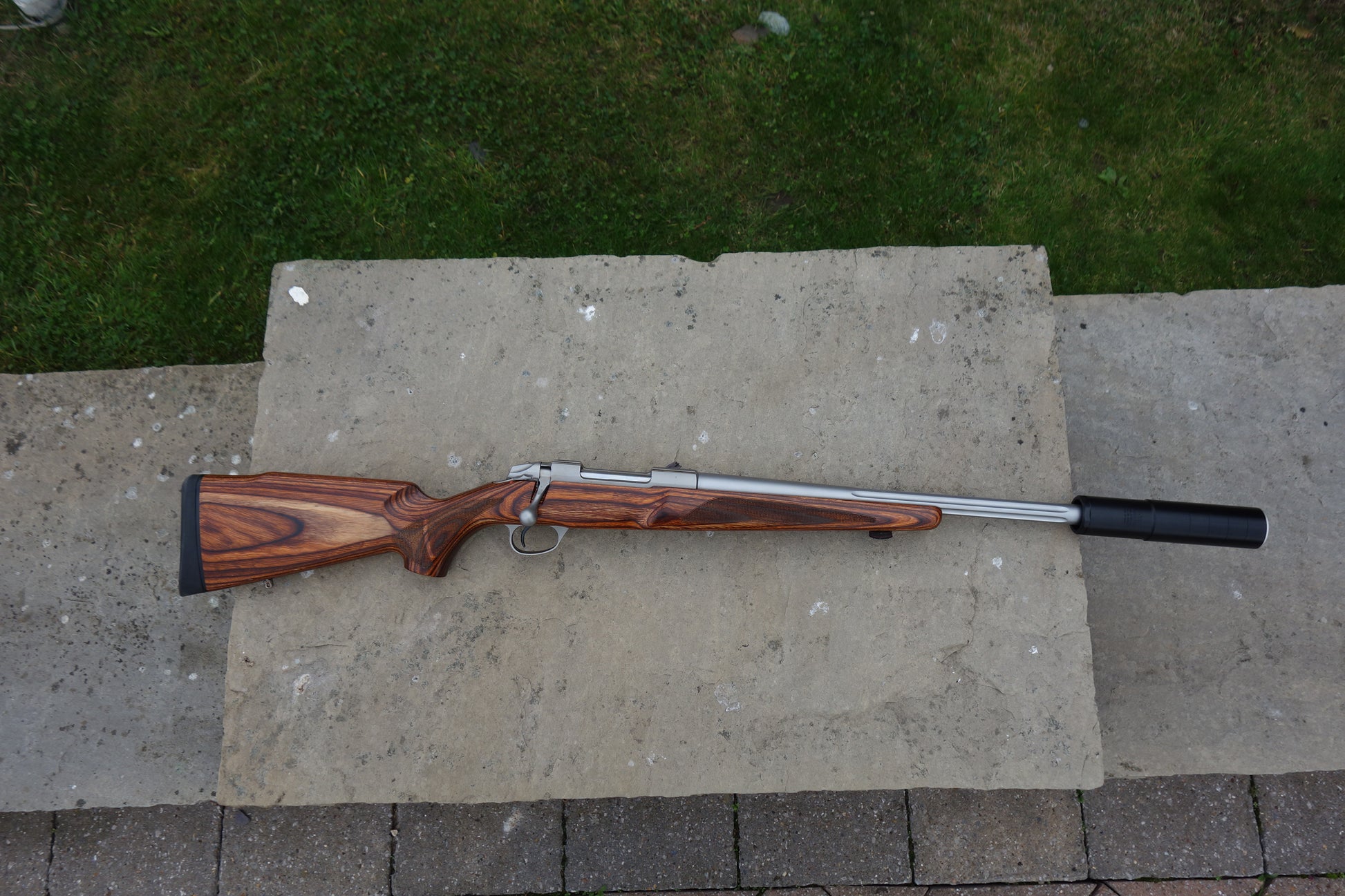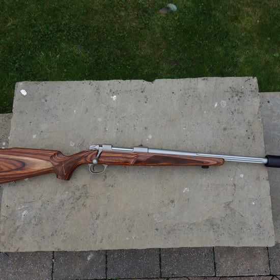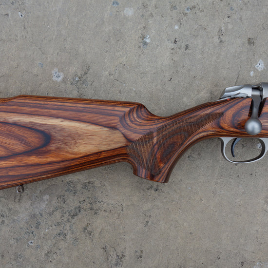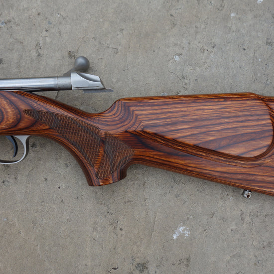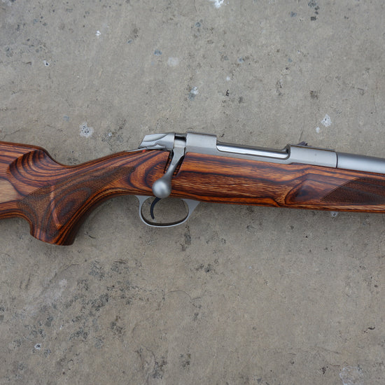Heavy 20" stainless fluted barrel bedded to a brown laminate stock, screw cut 18x1mm, 5 round detachable magazine, single set trigger, all in superb condition.