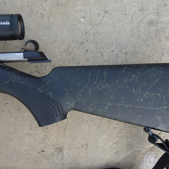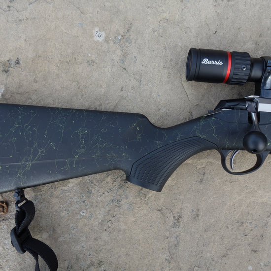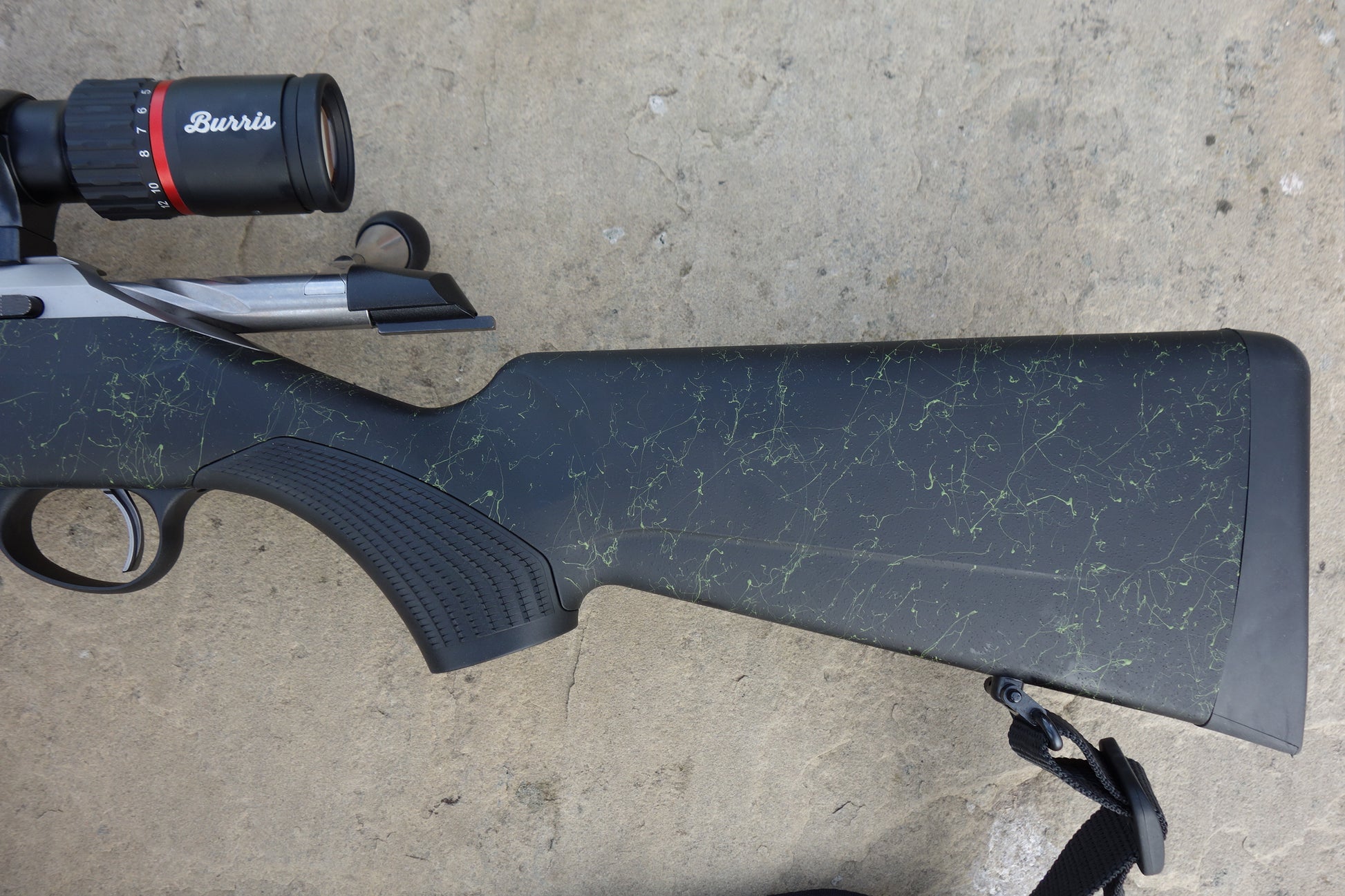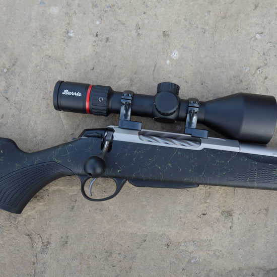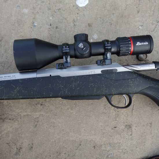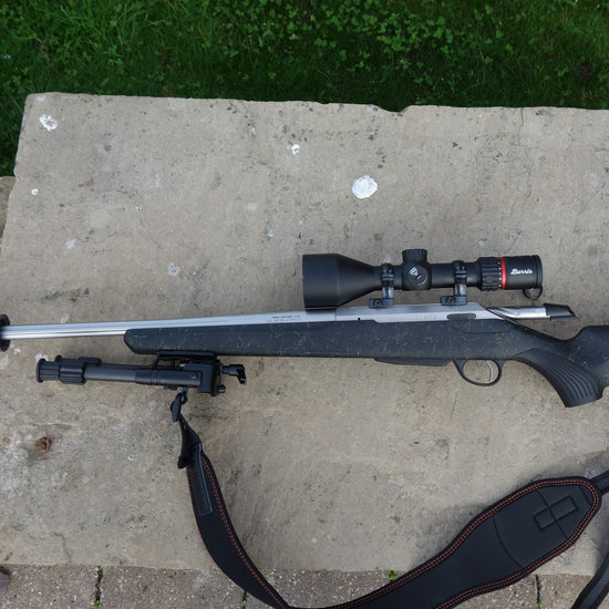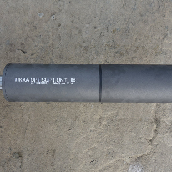 T3X Roughtech Emerald package, 20" stainless fluted barrel with 1-8" twist, fluted bolt with oversized bolt handle, Tikka Optisup sound moderator, Optilock steel scope mounts, Burris 3-12x56 illuminated Fullfield scope, carbon fibre bi-pod, neoprene sling and gun bag included.