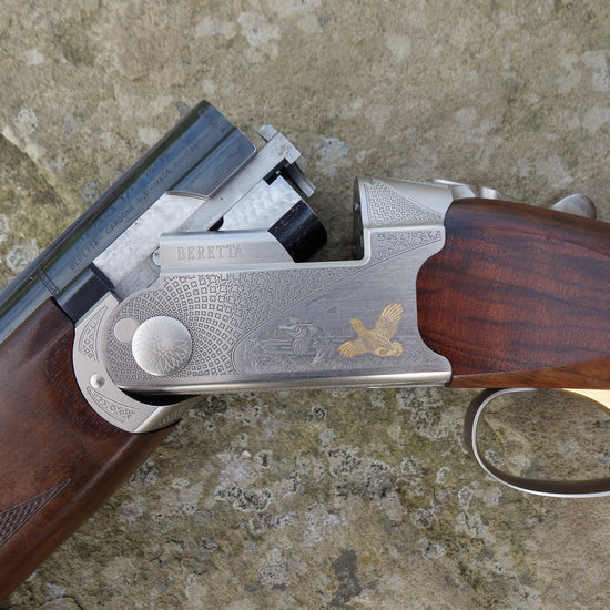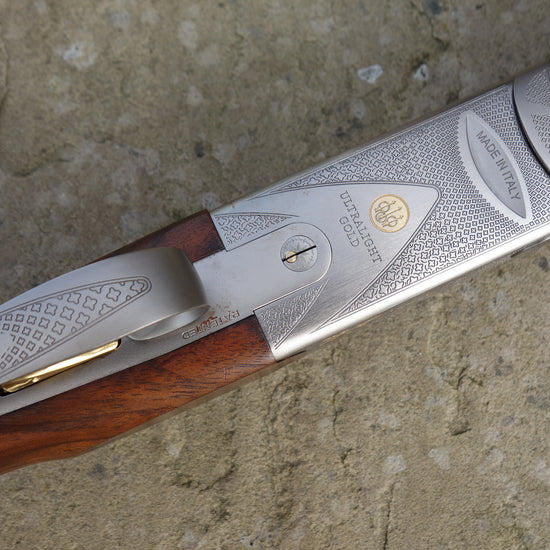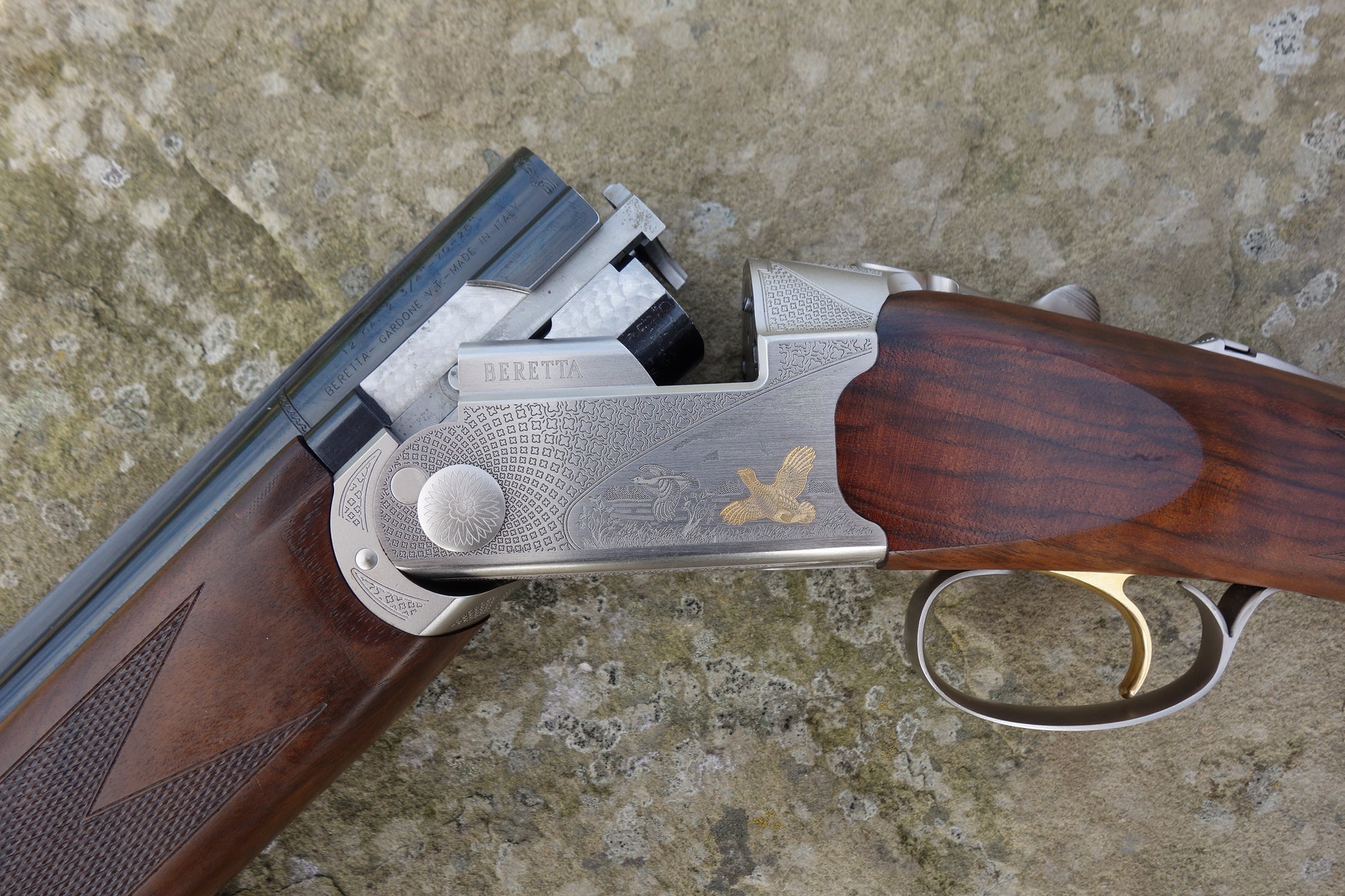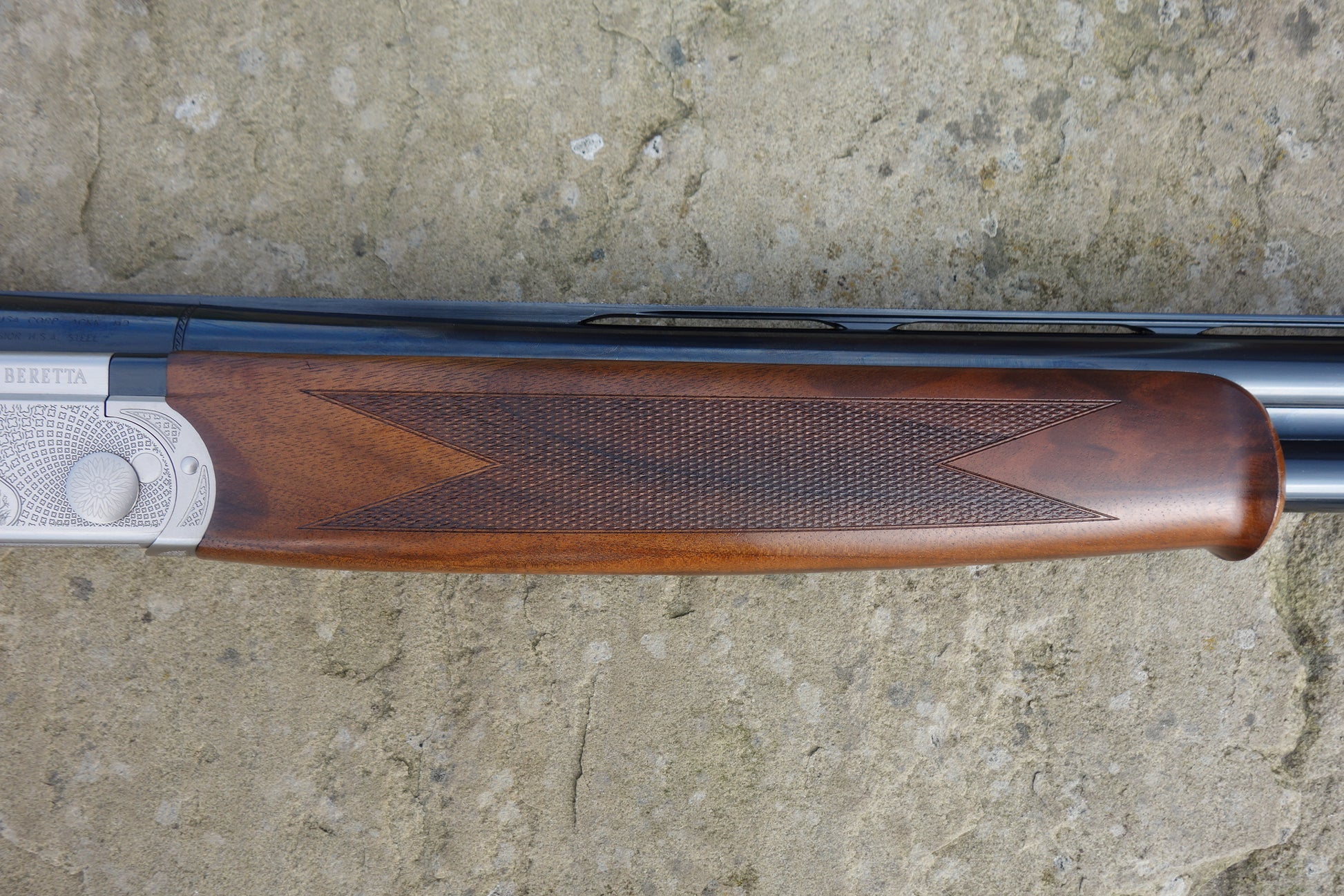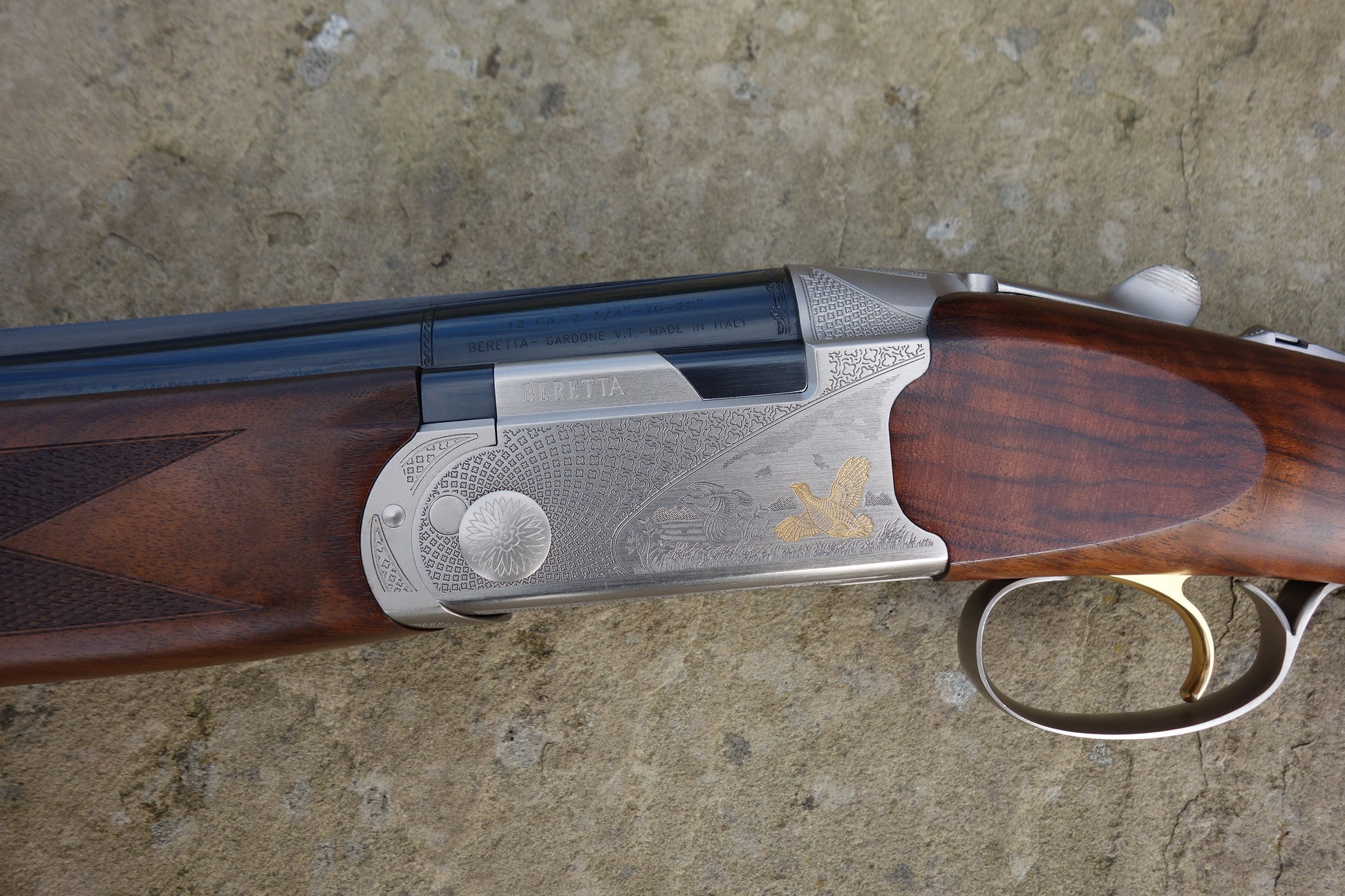 A beautiful example with highly figured stock and forend, light weight receiver engraved with game scenes, automatic safety catch, 2 3/4" chambers and HP steel proofed, pristine condition complete with Beretta ABS case.