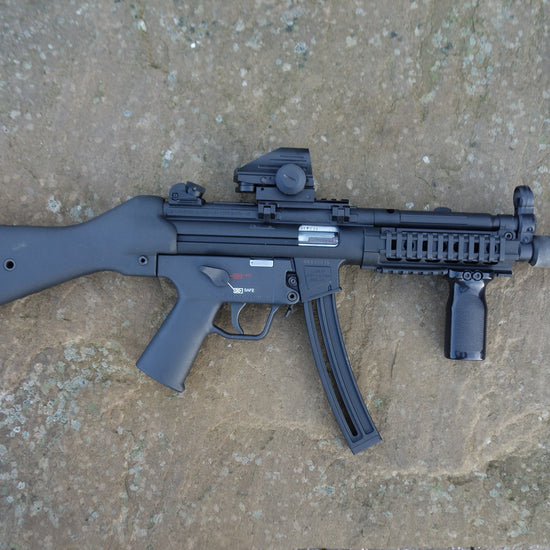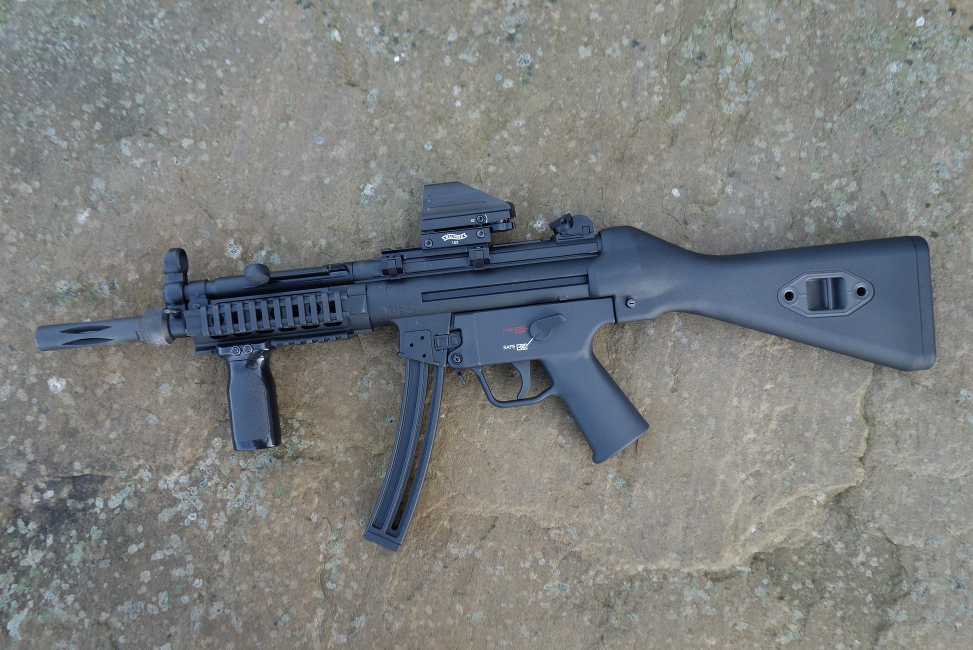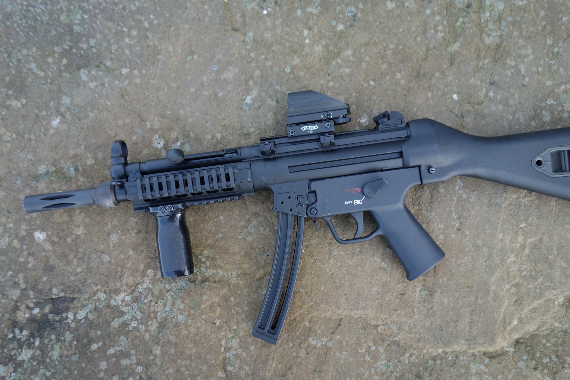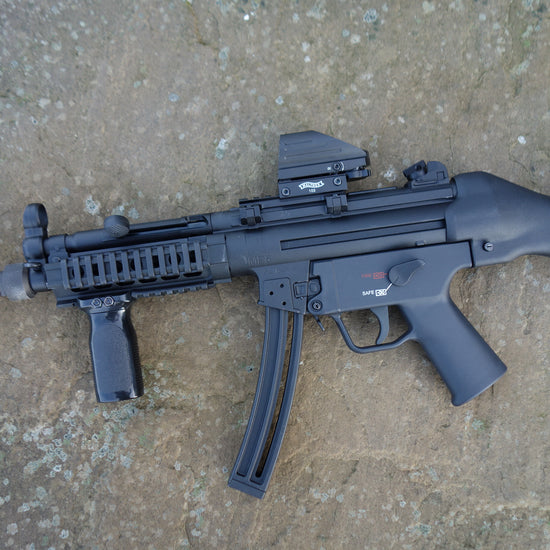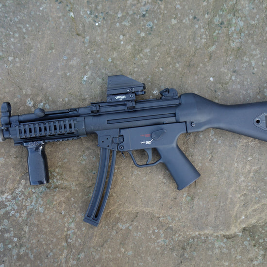 A quality reproduction by Walther featuring 3 x Picatinny rail forend with forward grip, Walther holo sight with multi reticule and range bag.