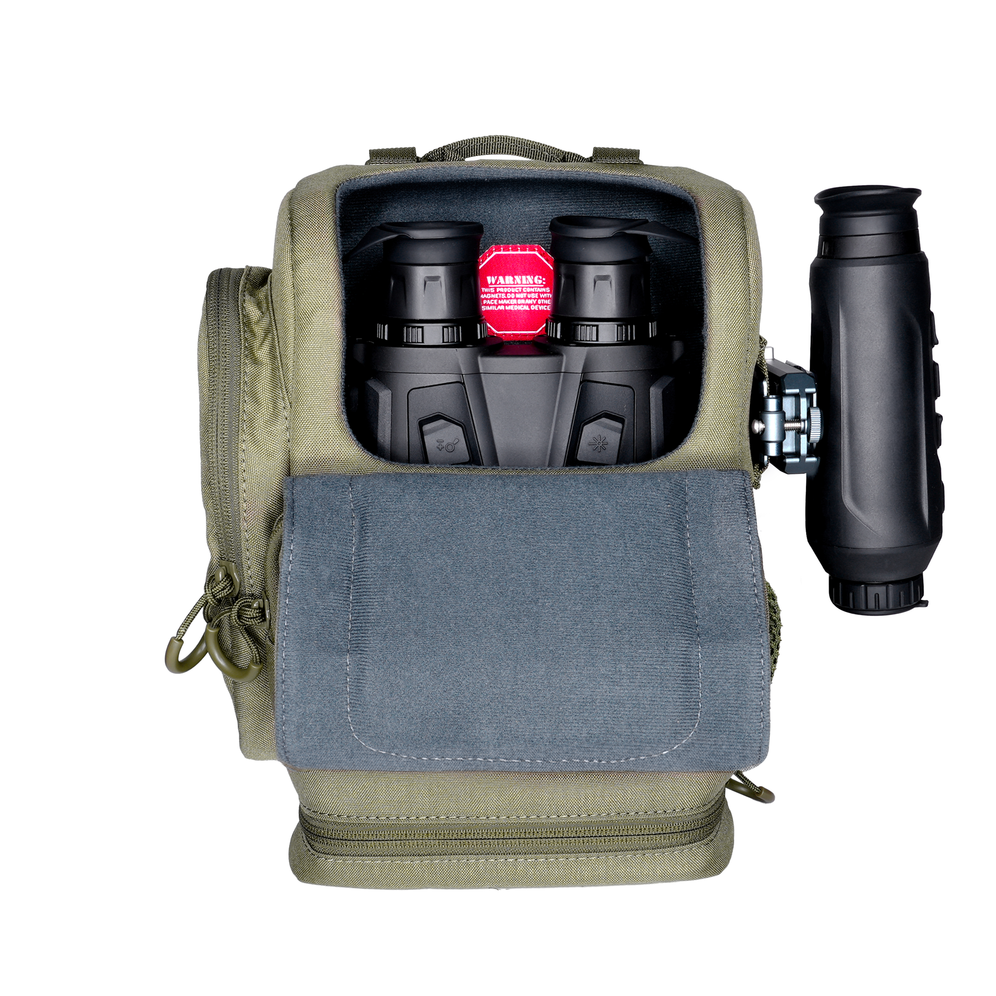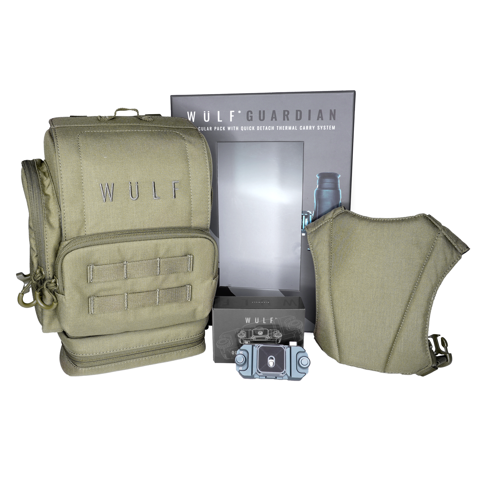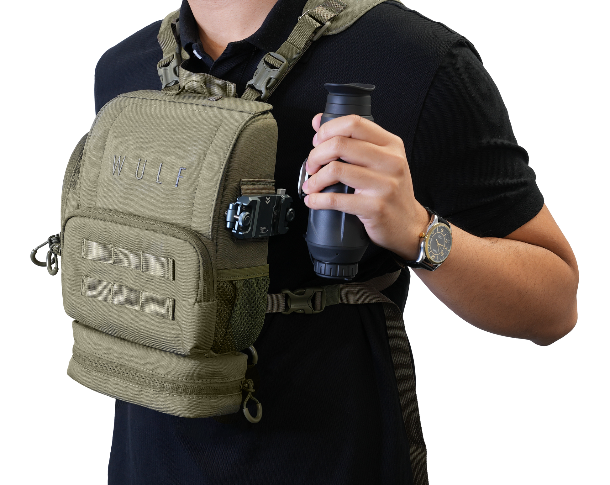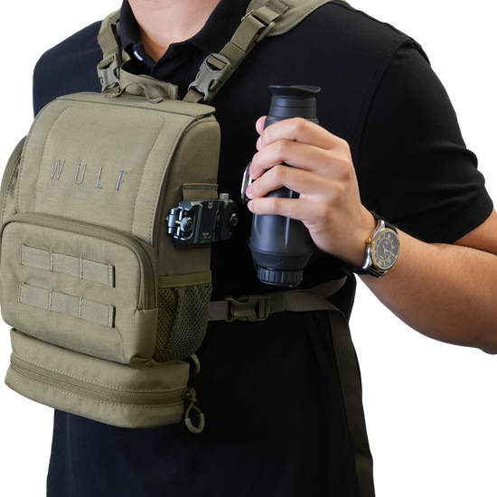 The WULF Guardian Binocular Harness offers exceptional comfort and stability for outdoor enthusiasts, featuring a quick detach thermal system for easy access to a thermal monocular. Its flexible binocular pouch, with removable foam inserts, securely fits various optics and operates silently with a magnetic closure. Crafted from durable Cordura and equipped with a pack-away storm shield, it ensures maximum protection against the elements. Adjustable straps evenly distribute weight, reducing fatigue, while its sleek green design blends seamlessly with outdoor gear. Perfect for hiking, birdwatching, or wildlife safaris, the WULF Guardian is your reliable companion for all adventures.